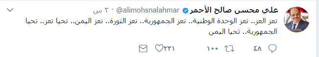 وقال الفريق في تغريدة له على تويتر” تعز العز.. تعز الوحدة الوطنية.. تعز الجمهورية.. تعز الثورة.. تعز اليمن.. تحيا تعز.. تحيا الجمهورية.. تحيا اليمن”.