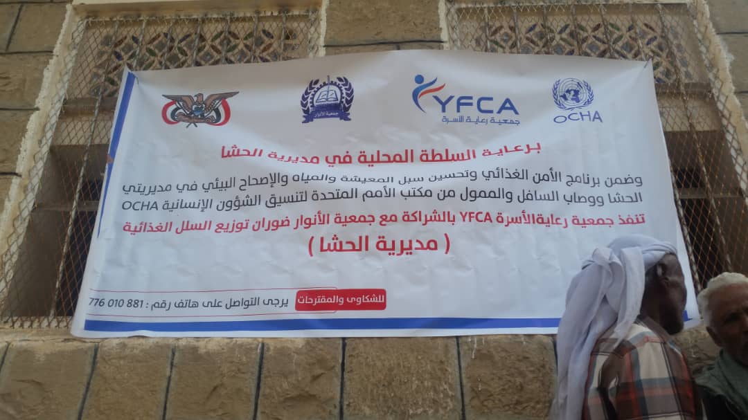 قامت جمعية رعايه الاسره بتدشين المرحله الثانية بتوزيع السلال الغذائية بمديرية الحشاء وحيث تم تغطية 7 عزل (مساله ، البيت ، بني مالك، بني صبح ، ضوران ، دمنه عتابه ، زربه ) ب 2600 سله غذائية