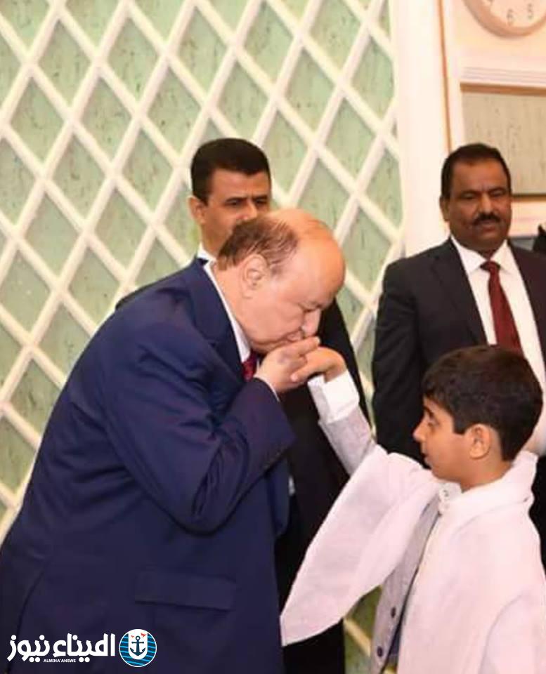 وفي صورة اخرى تداولها ناشطون على مواقع التواصل الاجتماعي ظهر احد الاطفال وهو يمسك يد رئيس الجمهورية ويقبض عليها بكلتى يدية ثم يقبلها في مشهد مؤثر يعبر عن المحبة التي يكنها الشعب “صغاراً وكباراً ” لقائدهم الرئيس عبدربه منصور هادي .