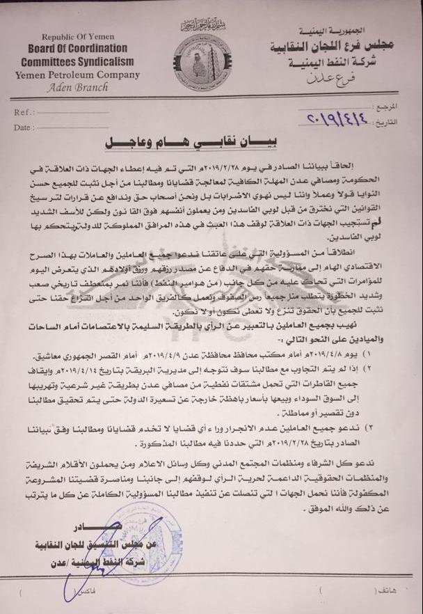 اهاب مجلس تنسيق اللجان النقابية في شركة النفط اليمنية بجميع العاملين في الشركة للمشاركة الفاعلة في تنظيم الوقفات الاحتجاجية السلمية التي دعا المجلس لتنظيمها دفاعا عن الشركة وحقوقها القانونية المشروعة ومطالب العاملين فيها بشان اغلاق مساكب الوقود المخالفة في شركة مصافي عدن وبصورة نهائية نظرا لاضرارها بمصالح الشركة ومصلحة المواطن والمصلحة العامة .