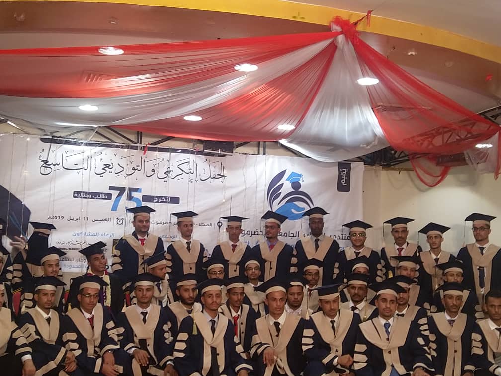 أقام منتدى الشباب الجامعي بحضرموت يوم امس الخميس حفل تخريج وتوديع الدفعة التاسعة من منتسبي المنتدى ، المنتدى الذي تأسس في العام 2010م يقيم سنوياً حفلاً توديعياً للطلاب الخريجين من مختلف محافظات الجمهورية كل عام ويعمل على تنمية وتأهيل قدرات الشباب الجامعيين ولم شملهم وإقامة الرحلات الترفيهية والأنشطة الثقافية ،
