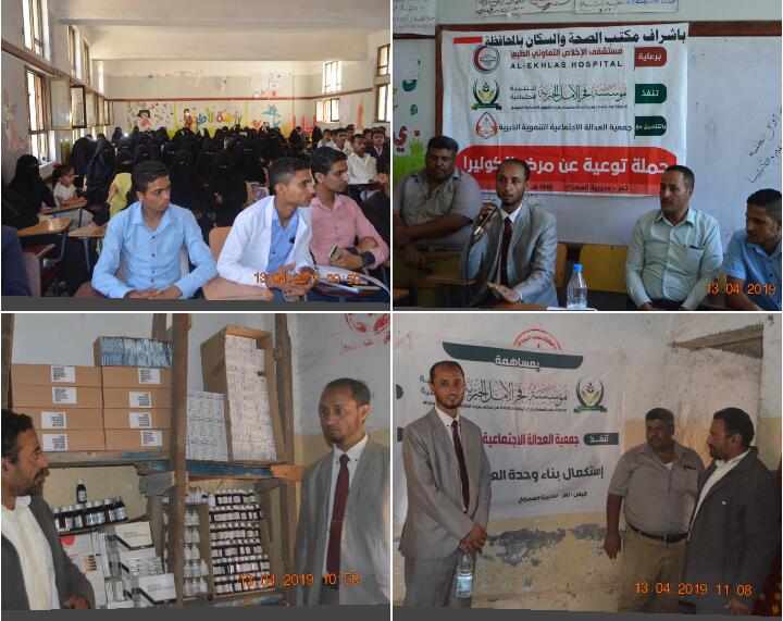 المهندس/ هزاع العامري رئيس جمعية العدالة اكد ان تنفيذ هذه الحملة ياتي ضمن التدخل السريع لمؤسسة فجر الامل وجمعية العدالة باشراف من مكتب الصحة والسكان ممثلا بالدكتور عبدالرحيم السامعي لوضع التدابير المناسبة للحد من هذا الوباء حيث سيتم نقل المصابين او المشتبه اصابتهم بالاسهالات الى الوحدة الصحية المجانية التابع لجمعية العداله وتوزيع المحاليل المعوضه والعلاجات مجانا.