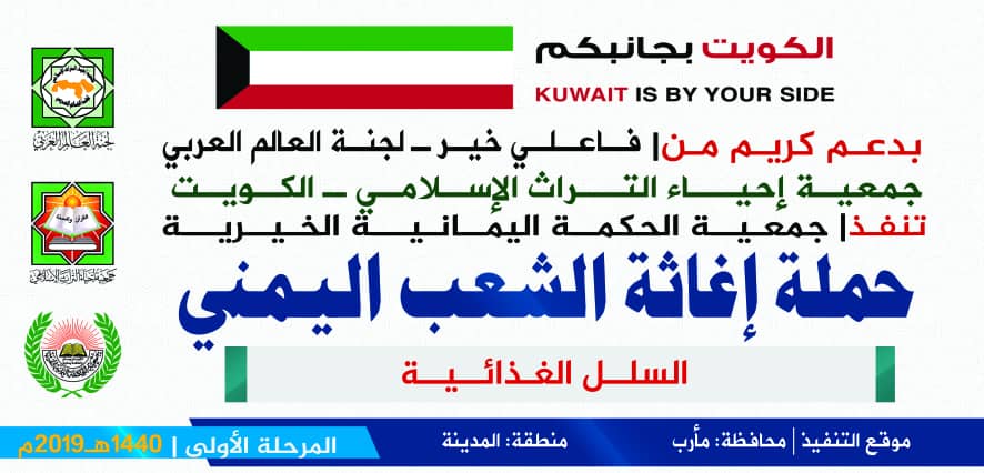 دشنت جمعية الحكمة اليمانية الخيرية مشروع توزيع السلات الغذائية لمحافظة مأرب وبتمويل من جمعية إحياء التراث الإسلامي – لجنة العالم العربي ضمن حملة الكويت بجانبكم، بحضور وكيل محافظة مأرب الشيخ / عبدالله الباكري