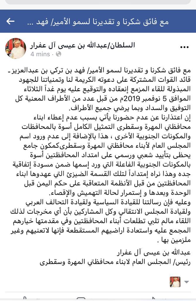 اعتذر المجلس العام لأبناء محافظتي المهرة وسقطرى عن حضور حفل توقيع اتفاق الرياض بين الحكومة الشرعية وما يسمى “المجلس الانتقالي الجنوبي” التابع للإمارات.