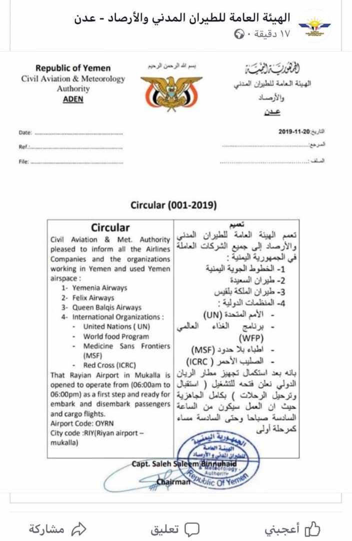 أكدت مصادر رسمية أن مطار الريان في حضرموت سيستقبل غدا السبت أول رحلة لطائرة أممية في إطار خطته لاستئناف العمل بعد توقف دام نحو خمس سنوات.