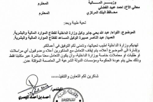 وفي وقت سابق وجه نائب رئيس مجلس الوزراء وزير الداخلية المهندس الميسري مذكرة رسمية، بعثها لوزير المالية ومحافظ البنك المركزي، بإيقاف التعامل مع كلا من وكيل قطاع الموارد البشرية و المالية اللواء عبدالله يحيى جابر و وكيل مساعد قطاع الموارد البشرية والمالية العميد عبدالناصر صبيرة وقضت توجيهاته بإيقاف التعامل مع الوكلاء المذكورين سابقا ، وعدم قبول أي مراسلات منهم أو حتى طلبات أو معاملات تتعلق بوزارة الداخلية.
