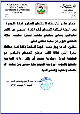 إلى ذلك، أعربت لجنة الاعتصام السلمي، في محافظة المهرة اليمنية، عن أمنياتها للسلطان قابوس بالشفاء.