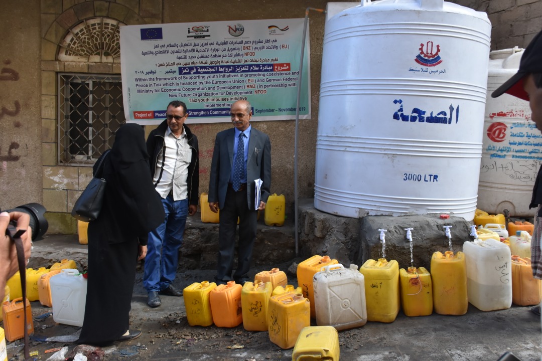 دشن مدير عام مكتب الشؤون الاجتماعية والعمل بمحافظة تعز الأستاذ / عبده علي مشروع صيانة واصلاح شبكة المياه المُحلاه في حي المناخ والذي تنفذه مبادرة ” نبضات تعز ” بالشراكه مع منظمة مستقبل جديد للتنمية ( NFOD ) وبتمويل من الوزارة الإتحادية الألمانية للتعاون الإقتصادي والتنمية ( BMZ ) والإتحاد الأروبي ( EU )