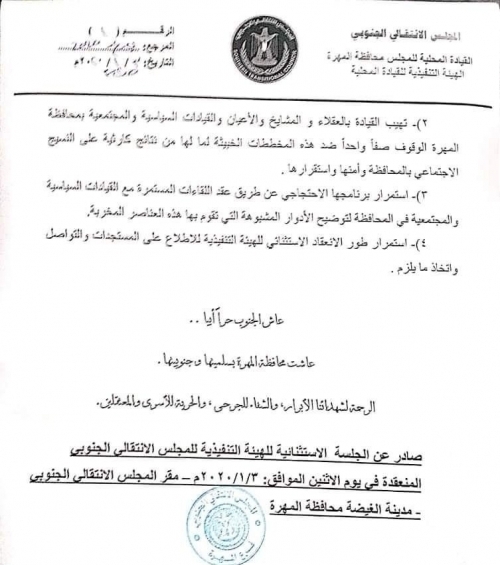 وكان “الانتقالي” عقد جلسة في مدينة الغيضة بمحافظة المهرة، أعلن فيها استمرار “الانعقاد الاستثنائي”، بعد أن فشل في تهييج الشارع العام ضد وزراء في الحكومة الشرعية من المناهضين للتواجد الإماراتي والسعودي في محافظة المهرة، والانتهاكات التي يقومون بها.