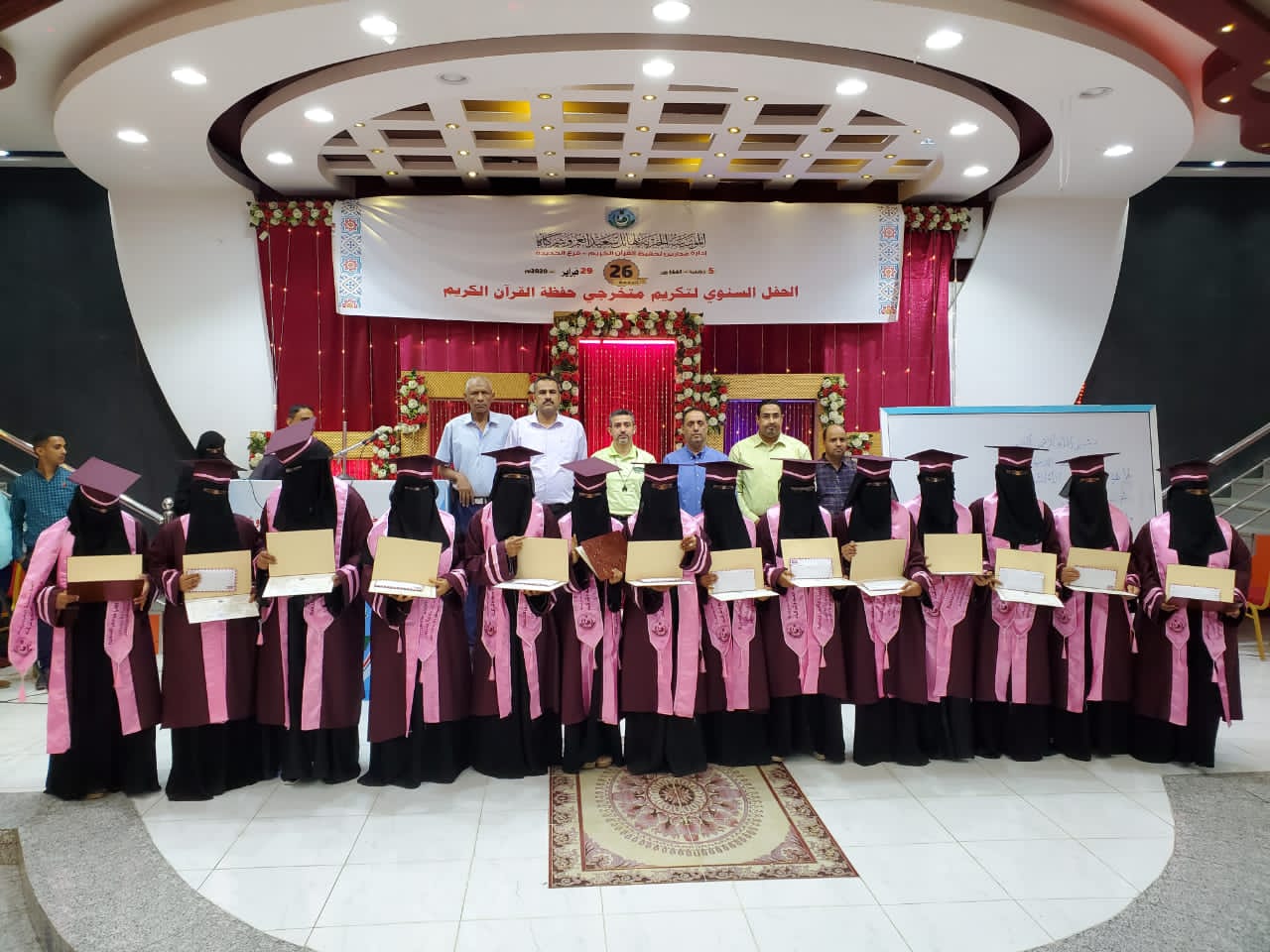 دشنت المؤسسة الخيرية لهائل سعيد أنعم وشركاه _ إدارة مدارس تحفيظ القرآن الكريم يومنا هذا السبت ٢٩ فبراير فعالية الحفل السنوي للدفعة ( 26) لمتخرجي حفظة القرآن الكريم في المركز الرئيس والفروع للعام ٢٠١٩/ ٢٠٢٠ الموافق 1440/1441 والذين بلغ عددهم ٢٠٠حافظ وحافظة لكتاب الله حيث خصص هذا الاحتفال لمتخرجات مدارس التحفيظ في محافظة الحديدة والبالغ عددهن ( 14 ) حافظة والذي انعقد في مجمع قاعات المنصور ..،