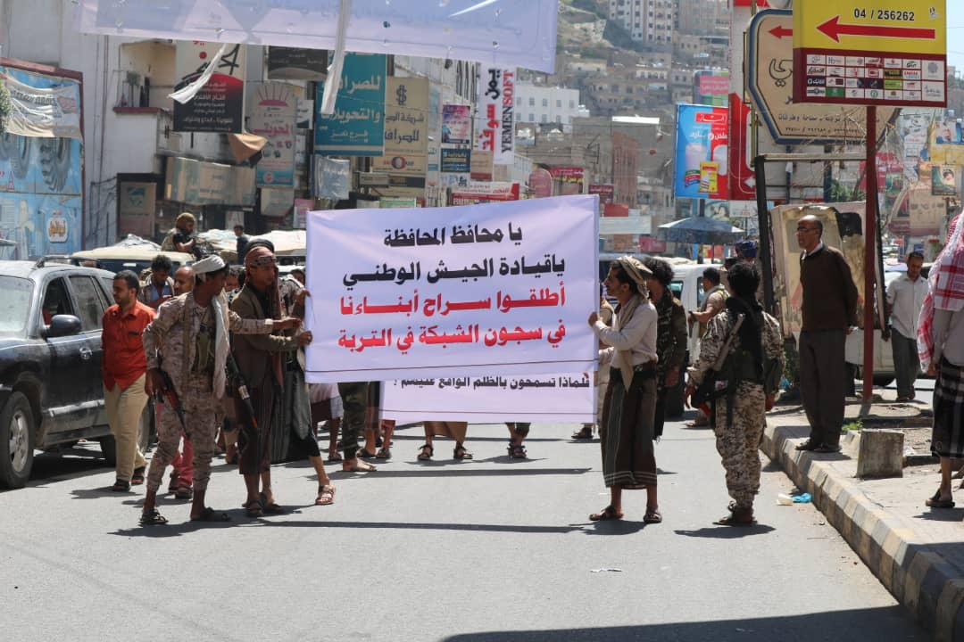 وطالب بيان المسيرة الصادر عن أسر الأفراد المحتجزبن “محافظ المحافظة والسلطة المحلية وقيادة الجيش الوطني سرعة الإفراج عن أبنائها الذين يقبعون خلف سجون الشبكة الذين تم إيقافهم من قبل لجنة التهدائة على ذمة الأحداث الأخيرة في مدينة التربة.