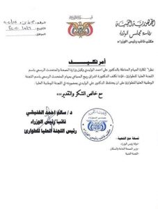 وقالت الوثيقة الصادرة عن رئيس لجنة الطوارئ الحكومية، نائب رئيس الحكومة سالم الخنبشي، أن يتم تعيين الدكتورة اشراق ربيع السباعي، متحدثاً رسمياً باسم اللجنة العليا للطوارئ، خلفًا للدكتور علي الوليدي.