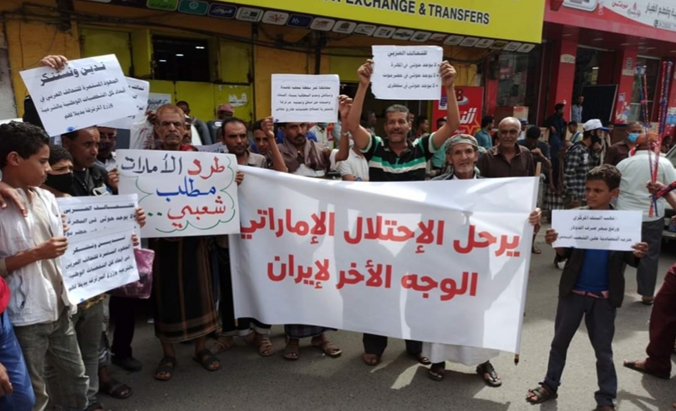 ورفع المحتجون شعارات تندد بتحركات الإمارات الأخيرة في محافظتي سقطرى وحضرموت، والتي تهدف إلى استكمال مخطط الإمارات الاستعماري.