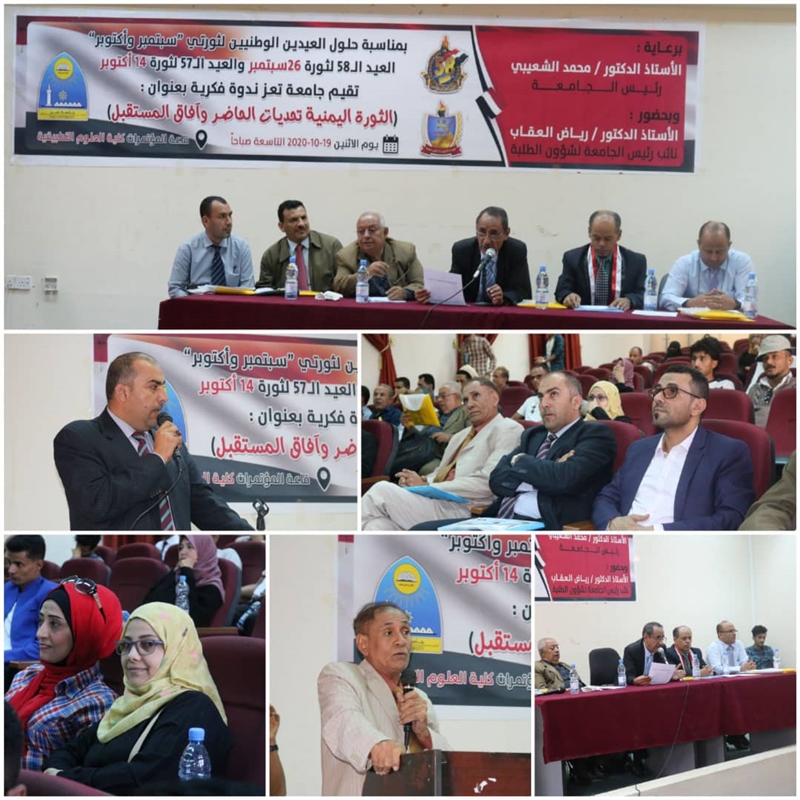 وخلال الندوة التي اقيمت برعاية رئيس الجامعة الدكتور محمد الشعيبي، أكد المشاركون على أهمية تجسيد قيم ومبادئ وأهداف الثورة اليمنية ( سبتمبر ، أكتوبر) باعتبارها نهجا يجب أن يمضي عليه اليمنيون لا استعادة الدولة وبناء مستقبل اليمن.