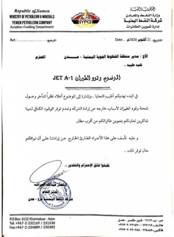 واعتذر البلاغ الخاص بشركة النفط اليمنية فرع عدن عن الإجراء الطارئ الخارج عن إرادة الشركة في عدم مقدرتها على تزويد الطائرات بالوقود الخاص.