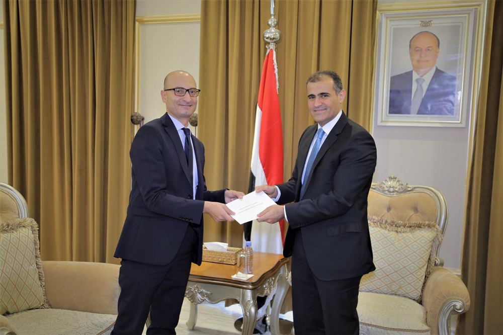 تسلم وزير الخارجية محمد الحضرمي، الخميس، نسخة من أوراق اعتماد السفير الفرنسي الجديد لدى اليمن جان ماري سافا.