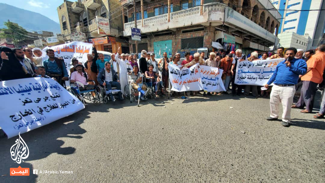 تظاهر العشرات من جرحى تعز، صباح اليوم الاثنين، تنديدًا باحتجاز مليشيا الانتقالي لزملائهم الجرحى في عدن.