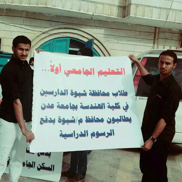 نظم طلاب من أبناء محافظة شبوة الدارسين في كلية الهندسة بالعاصمة المؤقتة عدن وقفة احتجاجية أمام سكنهم وأمام كلية الهندسة احتجاجا على التهميش وعدم تفقد أحوال سكنهم من قبل السلطة المحلية بمحافظة شبوة والذي أصبحوا مهددين بالطرد منه.