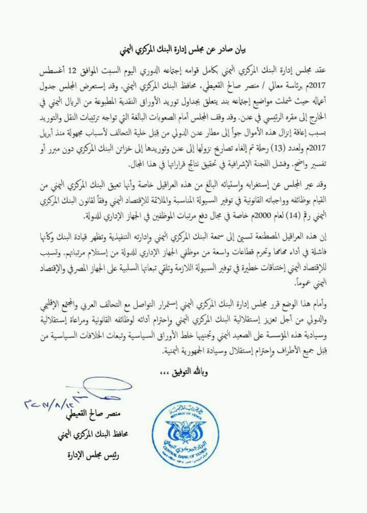 واختتم المحافظ بيانه:” أمام هذا الوضع قرر مجلس إدارة البنك المركزي اليمني إستمرار التواصل مع التحالف العربي والمجتمع الإقليمي والدولي من أجل تعزيز إستقلالية البنك المركزي اليمني وإحترام أدائه لوظائفه القانونية ومراعاة إستقلالية وسيادية هذه المؤسسة على الصعيد اليمني وتجنيبها خلط الأوراق السياسية وتبعات الخلافات السياسية من قِبَل جميع الأطراف وإحترام إستقلال وسيادة الجمهورية اليمنية.