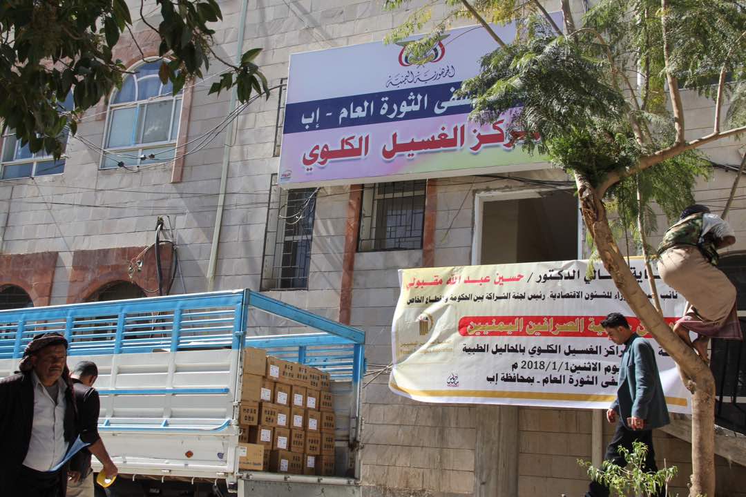 تسلم مركز الغسيل الكلوي بمستشفي الثورة بمدينة اب محاليل لمرضي الفشل الكلوي بدعم من جمعية الصرافين اليمنيين.