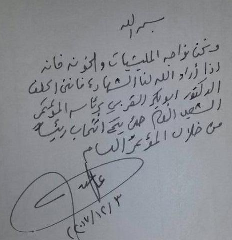 وتكشف الوصية المتداولة عن تكليف صالح للقيادي في حزب المؤتمر ابو بكر القربي بقيادة الحزب خلفا له.