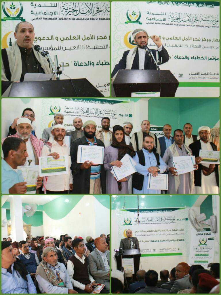 بحضور وكيل المحافظة الدكتور عبدالقوي المخلافي والقاضي خالد البركاني مدير عام مكتب الأوقاف والإرشاد بالمحافظة والأستاذ عبدالواسع الشدادي مدير عام مكتب التربية والتعليم بالمحافظة والأستاذ عبده علي مدير عام مكتب الشؤون الاجتماعية بالمحافظة والعقيد صادق الحسامي مدير البحث الجنائي بالمحافظة والشيخ منصور الشوافي والشيخ عبدالبديع التركي والعديد من الشخصيات الاجتماعية والدعوية دشنت مؤسسة فجر الأمل الخيرية للتنمية الاجتماعية فعالية إشهار مركز فجر الأمل العلمي والدعوي في محافظة تعز .