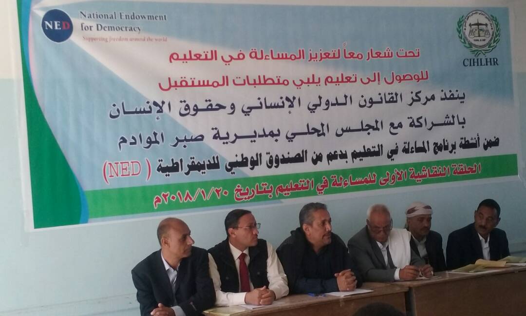 نفذ مركز القانون الدولي الانساني وحقوق الإنسان بالشراكة مع المجلس المحلي بمديرية صبر الموادم على قاعة مجمع الشهيد محمد علي عثمان صباح اليوم حلقة نقاشية حول المساءلة الاجتماعية في التعليم .