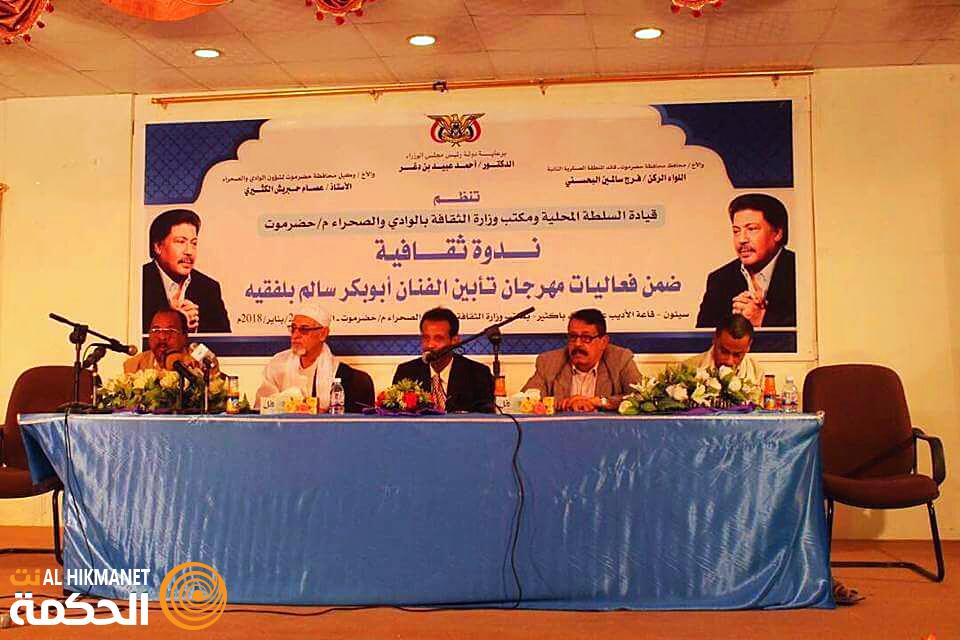 برعاية من دولة رئيس الوزراء الدكتور احمد عبيد بن دغر نظمت السلطة المحلية بحضرموت ومكتب وزارة الثقافة بالوادي والصحراء ندوة ثقافية عن الفنان أبوبكر سالم بلفقيه. وفي الندوة التي حضرها معالي وزير الثقافة الاستاذ / مروان دماج قدمت عدد من الأوراق البحثية في عدة محاور تاريخية وفنية وادبية في حياة الفقيد الدكتور الفنان / ابوبكر سالم بلفقيه وذلك بمشاركة عدد من اساتذة الأدب والنقد والفن وكذا أقارب الفقيد حيث قدمت أيضا قراءات فنية وأدبية تحليلية في لحن وشعر وطرب أيقونة الفن الحضرمي واليمني ” بلفقيه” وستختتم فعاليات تأبين الفقيد الدكتور الفنان ابوبكر سالم بلفقيه بحفل تأبيني بمسقط رأسه مدينة تريم يحضره عشاق ومحبي الراحل .