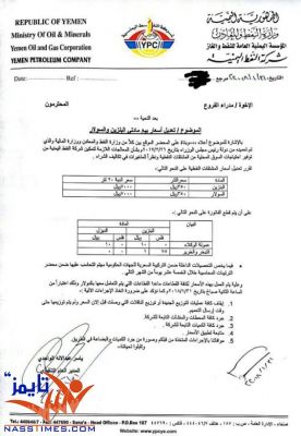 وبحسب والوثيقة الرسمية التي تحصلت عليها مواقع اعلامية فان سعر البترول الجديد قد ارتفع رسمياً من 3500 الى 7000ريال للدبة سعة 20لتر وكذا هو سعر الديزل