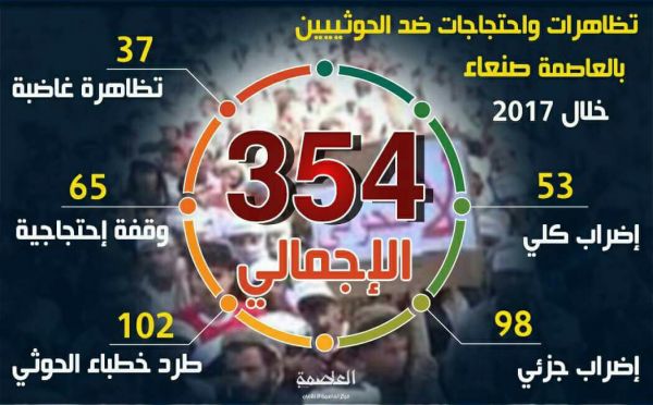 وكشفت وحدة الرصد بمركز العاصمة الاعلامي عن “354” فعالية نضالية شهدتها العاصمة صنعاء خلال العام المنصرم 2017م، ضد مليشيات الحوثي الانقلابية، وتنوعت بين “وقفات احتجاجية، وتظاهرات غاضبة، وإضرابات كلية وأخرى جزئية”، في عدة مؤسسات ومرافق حكومية، فيما انتهى العام المنصرم بمواجهات دامية بين جماعة الحوثيين وأنصار الرئيس السابق علي عبدالله صالح إثر دعوات الأخير لمقاومة الحوثيين وتحرير العاصمة صنعاء.