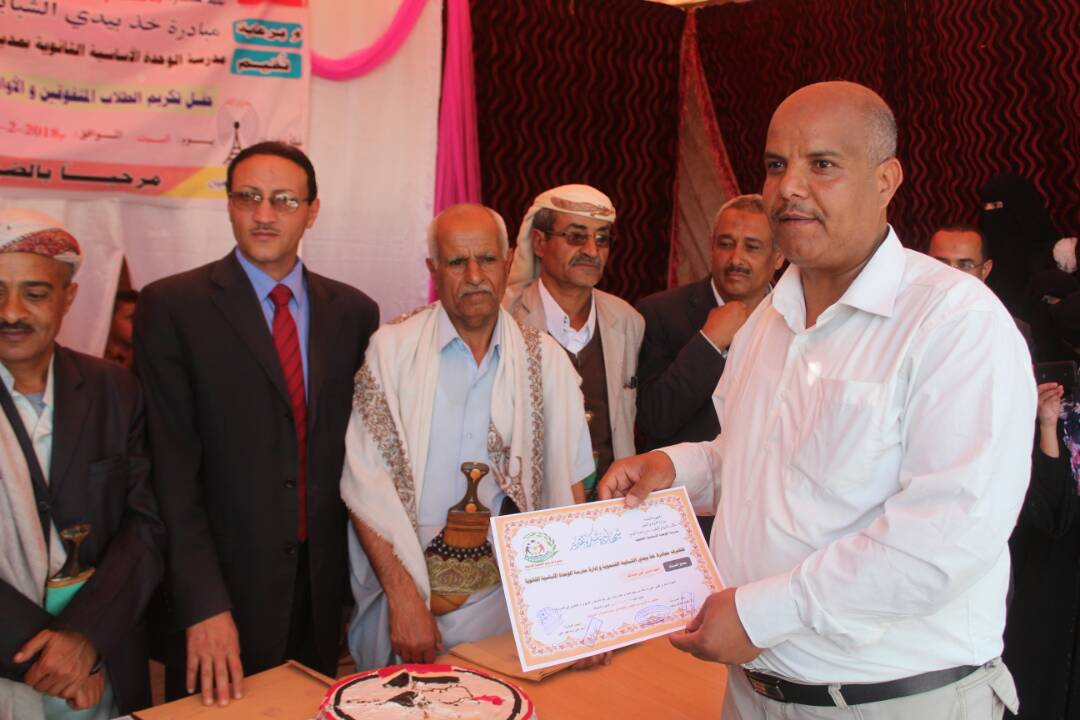 دشنت مبادرة خذ بيدي الشبابية التنموية صباح اليوم السبت في مدينة تعز مديرية صبر الموادم حفل تكريم الطلاب المتفوقين والأوائل في مدرسة الوحدة الأساسية الثانوية.