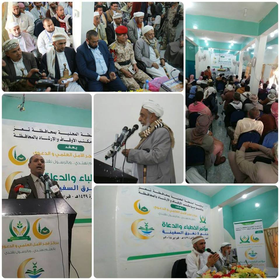 وينعقد مؤتمر الخطباء والدعاة برعاية السلطة المحلية وبالتنسيق مع مكتب الأوقاف والإرشاد بالمحافظة ويشارك فيه أكثر من 90 خطيب وداعية من مدينة تعز والمناطق المحررة .
