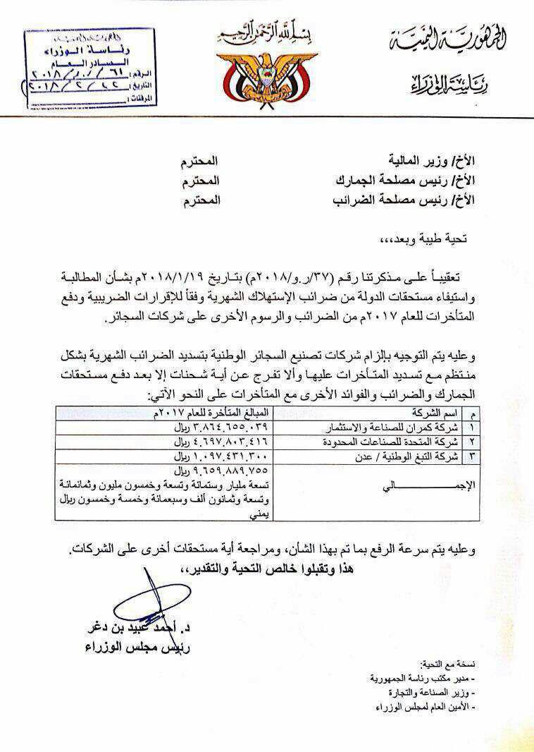 وكان الدكتور بن دغر رئيس الوزراء قد اصدر توجيهاته في تاريخ 22فبراير الى وزارة المالية ومصلحتي الجمارك والضرائب في عدن بعدم الافراج عن شحنات التبغ والمواد الخام الا بعد الزام شركات السجائر الوطنية بدفع الضرائب المتاخرة عليها لحساب الدولة والبالغه اكثر من 9مليار و659مليون ريال.