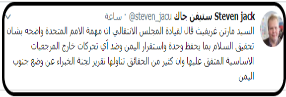 وكشف كبير خبراء مجلس الأمن الدولي ستيفن جاك أن المبعوث الأممي إلى اليمن مارتن غريفيث قال لقيادة المجلس الانتقالي ان مهمة الامم المتحدة واضحة بشأن تحقيق السلام بما يحفظ وحدة واستقرار اليمن.