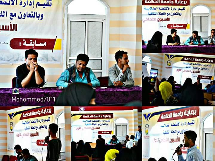 وأشار رئيس اللجنة الثقافية عبدالله الحمادي، إلى أن الاسبوع الثقافي مستمر في إكتشاف جميع المواهب وتأهيلها بهدف تحفيزهم وتشجيعهم وإكتشاف مهاراتهم بما ينمي من تطلعاتهم وأحلامهم المستقبلية، مضيفا أن اللجنة الثقافية تستمر في إستقبال جميع المشاركات الثقافية وبكافة أنواع المجالات، مثمنا الجهود الكبيرة من قبل مدير جامعة الحكمة تعز الدكتور/ عبده محمد الكليبي، في دعم اللجنة الثقافية في إقامت الاسبوع الثقافي وجميع الانشطة الثقافية التي تتم داخل الجامعة.