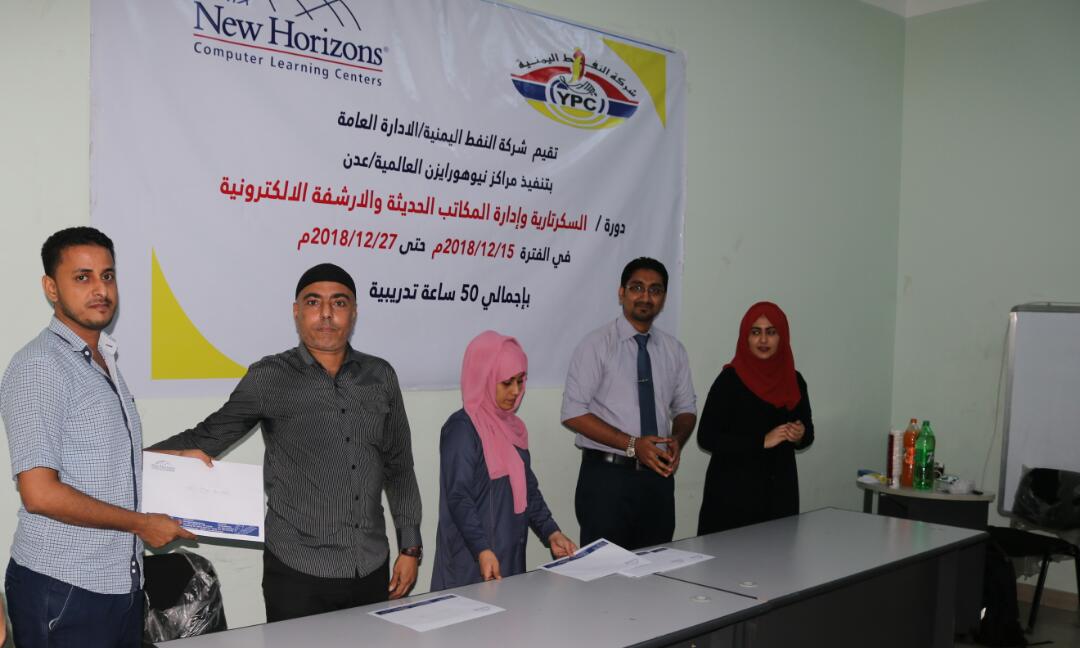 اختتمت اليوم بفرع مراكز نيوهورايزن العالمية للتدريب والتاهيل في العاصمة عدن فعاليات الدورة التدريبية الخاصة بمجال السكرتارية وادارة المكاتب الحديثة والارشفة والتي كانت قد استمرت نحو اسبوعين بمشاركة ( 12 ) موظفا وموظفه من الادارة العامة لشركة النفط اليمنية وفرعها في عدن.