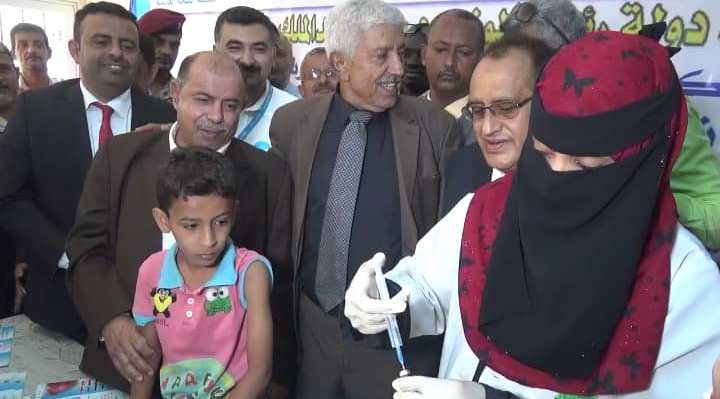 دشن نائب رئيس الوزراء الدكتور سالم الخنبشي ووزير الصحة العامة والسكان الدكتور ناصر باعوم صباح اليوم، بالمجمع الصحي بالميدان بمديرية صيرة بالعاصمة المؤقتة عدن ،الحملة الوطنية للتحصين ضد مرض الحصبة والحصبة الالمانية التي تنطلق في جميع المرافق الصحية والمدارس والمواقع المؤقتة للأطفال بمختلف المحافظات.
