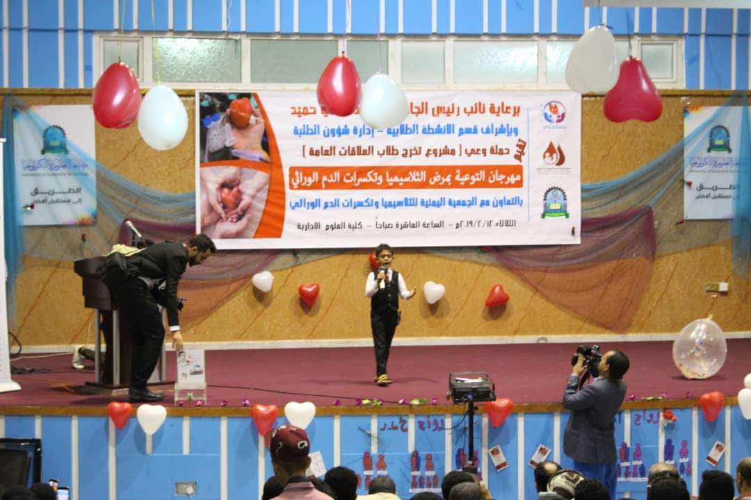 وتخلل المهرجان، الذي أُقيم في قاعة الاحتفالات بالجامعة، عدة فقرات، منها كلمة لطفل من ضحايا الثلاسيميا، نقل للحاضرين مرارة المعاناة التي يعيشها، إضافة إلى عمل مسرحي فني يتحدث عن أهمية الفحص قبل الزواج، واستطلاع لآراء الشباب الحاضرين حول إمكانية عمل فحص قبل الزواج للوقاية من المرض، كما تم جمع تبرعات لصالح الجمعية اليمنية للثلاسيميا.