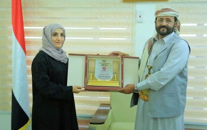 كرم محافظ مأرب اللواء سلطان العرادة, الخميس, الناشطة الحقوقية ياسمين القاضي الحاصلة على جائزة المرأة الدولية للشجاعة.