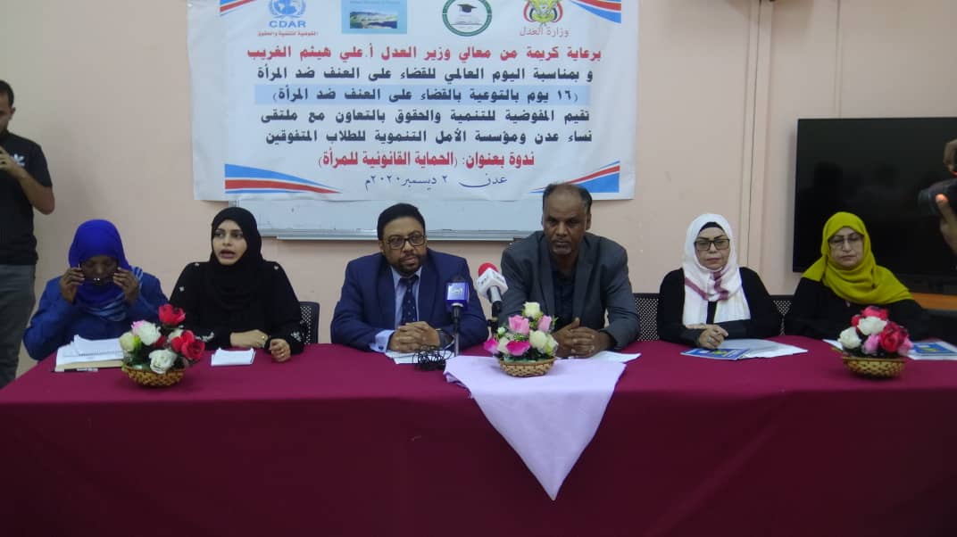 برعاية وزير العدل الأستاذ/علي هيثم الغريب نظمت اليوم المفوضية للتنمية والحقوق ندوة تحت عنوان ( الحماية القانونية للمرأة ) بالشراكة مع ملتقى نساء عدن ومؤسسة الأمل التنموية للطلاب المتفوقين بمشاركة 40 ناشط وناشطة إعلاميين وحقوقيين وأكاديميين ومنظمات مجتمع مدني .