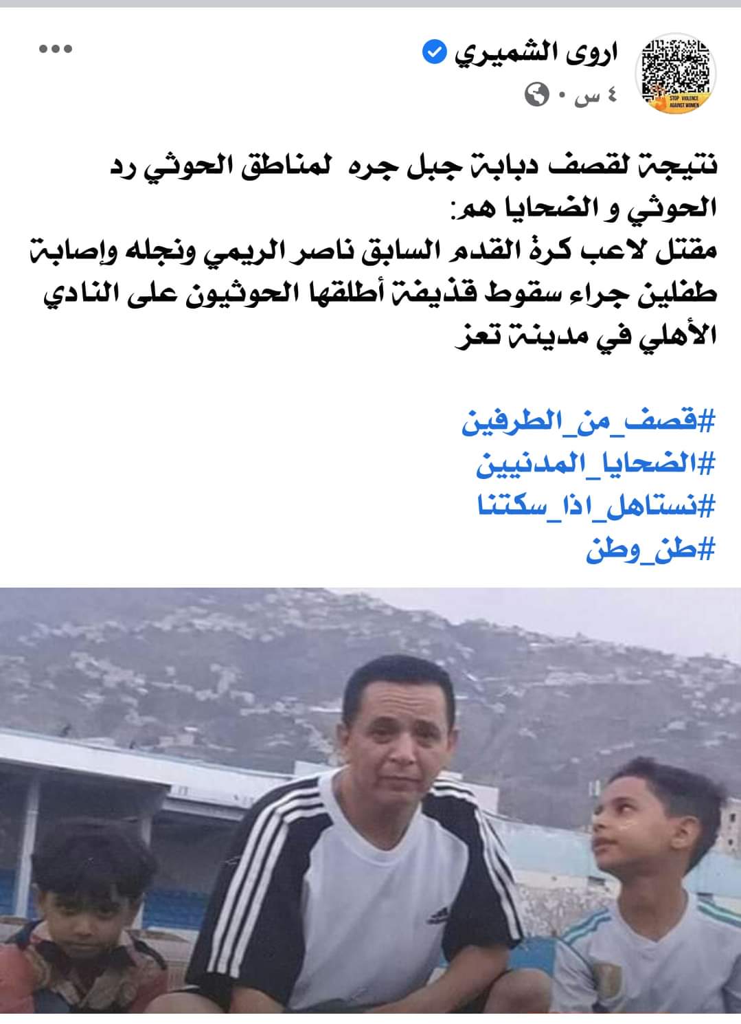 وأمس السبت، بررت الناشطة أروى الشميري قصف مليشيا الحوثي على ملعب نادي الأهلي الرياضي والذي أدى إلى استشهاد الكابتن ناصر الريمي ونجله أثناء تواجدهم في النادي.