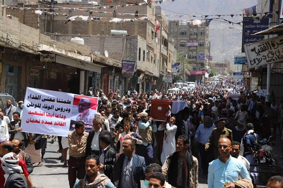 شيعت تعز اليوم الجمعة جثمان قائد مقاومة الحجرية وقائد الكتيبة الأولى باللواء الرابع مشاة جبلي، العقيد عبده نعمان الزريقي، بمدينة تعز جنوبي غرب اليمن.